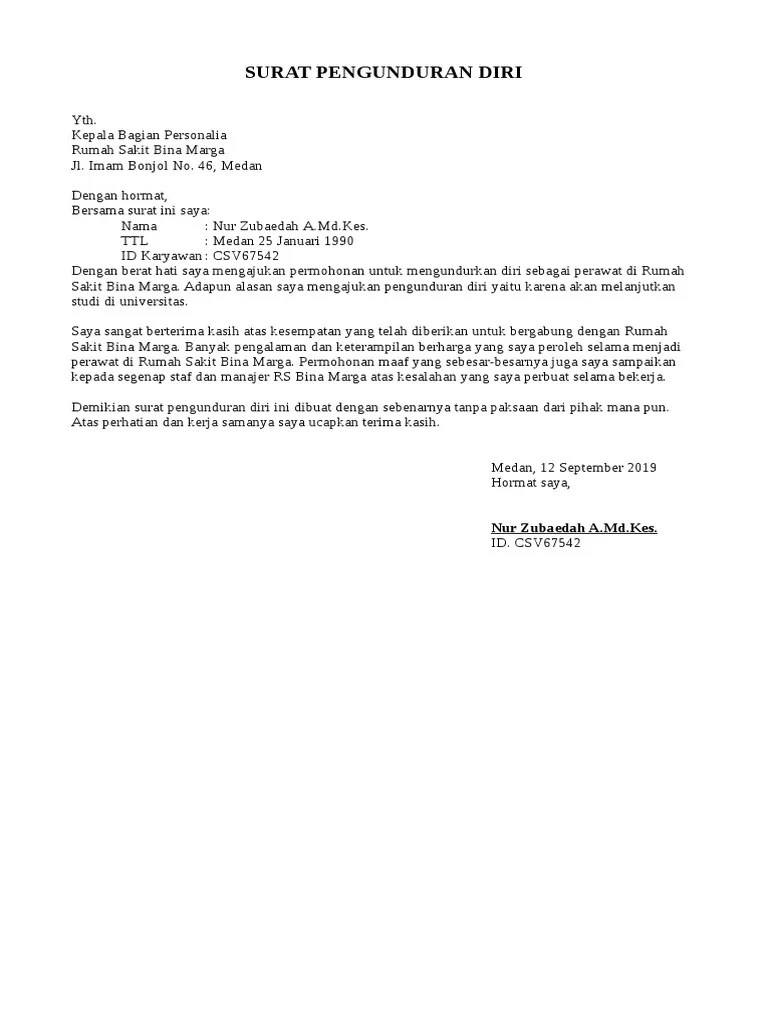 Contoh surat pengunduran diri karyawan pabrik. Surat ini saya buat sesuai dengan prosedur hubungan industrial dan . Damai abadi karena sakit yang saya derita. Contoh surat pengunduran diri perawat rumah sakit. Untuk mengundurkan diri tentu kita harus lebih dulu mengajukan .